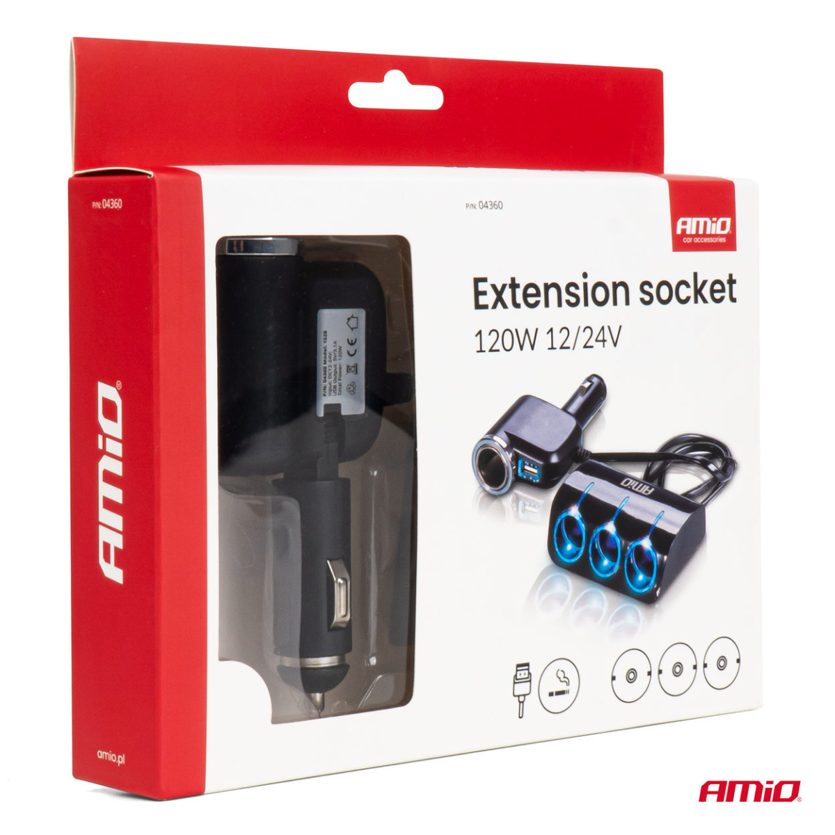 Kolme pesaga pikendusjuhe laadijaga 1x USB-A + 1x sigaretisüütaja 12/24V 120W 80 cm AMIO-04360