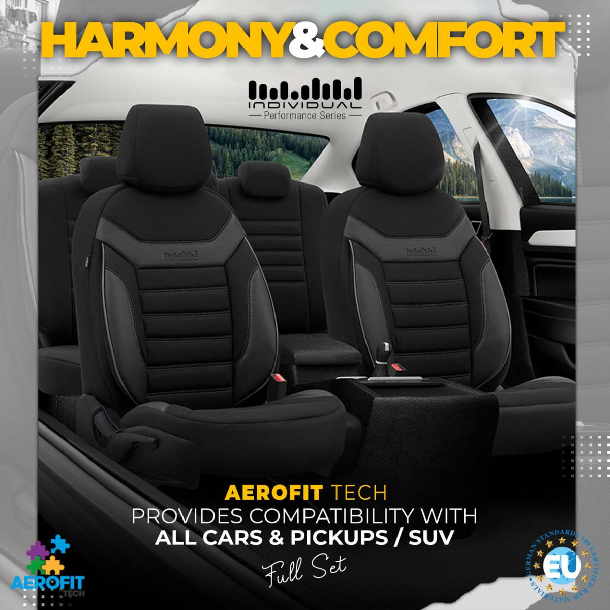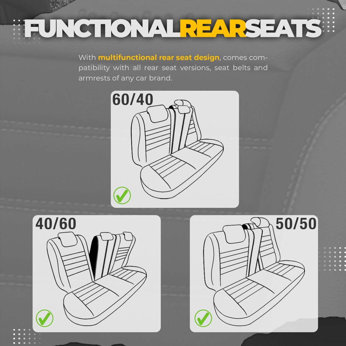 Kõik materjalid on lamineeritud polüuretaanvaht, mis hoiab ära katete libisemise istmetel. Katted katavad istmed täielikult, seega kaitsevad need neid ideaalselt mustuse eest, on vastupidavad ja kergesti puhastatavad. Moodsad disainid uuendavad auto salongi ja parandavad esteetikat.